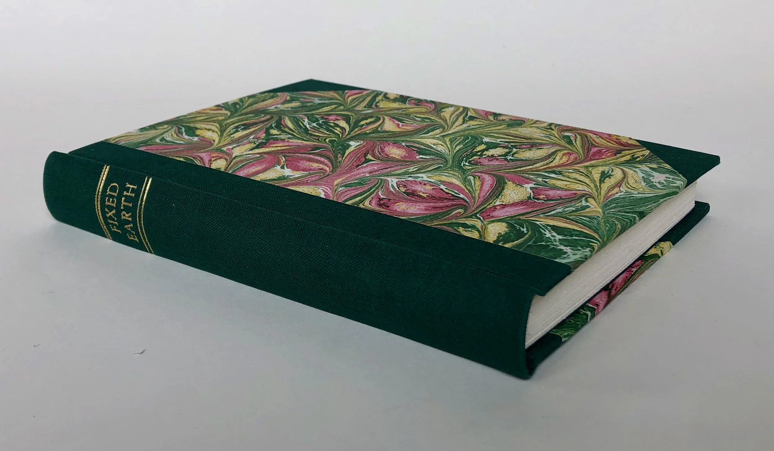 Half dark green cloth case with marbled paper sides, dark green cloth stuck-on endbands, solid dark green endpapers, stamped directly in gold foil